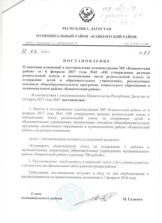 Документ об установлении размера платы, взимаемой с родителей (законных представителей)